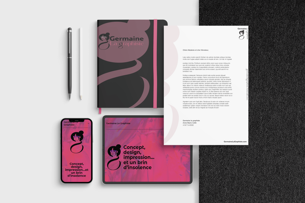 Le branding, c’est l’âme de ton projet en version visuelle. Je crée des identités qui ont du caractère, du flair et une vraie personnalité. Nom, logo, couleurs, dérivés : pensé pour marquer les esprits. Germaine ne reste pas dans le moule!